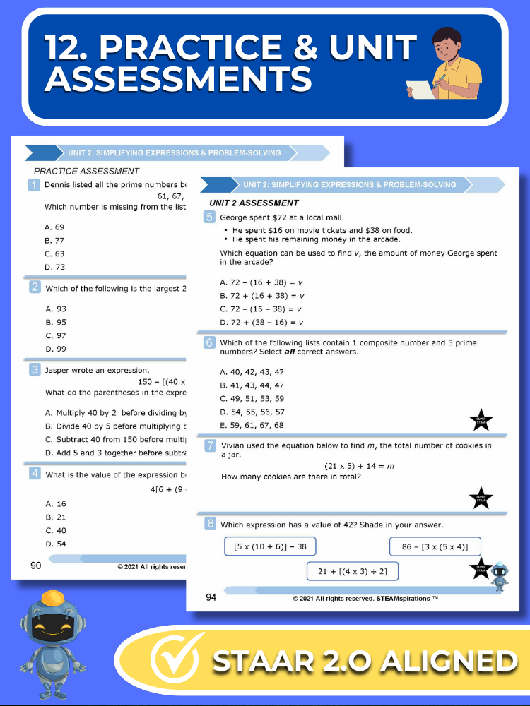 Practice and Unit Assessments: Reflecting the STAAR test's rigor, each unit includes a practice assessment and a comprehensive unit assessment featuring STAAR 2.0 questions.