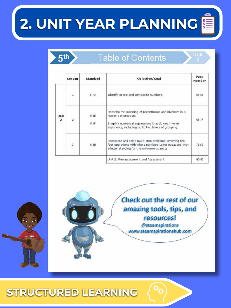 - Unit Year Planning: Our curriculum breaks down each TEK into manageable segments, scaffolding learning for complete mastery. This methodical approach allows students to fully understand each part of the TEK as it is taught throughout the lessons, making the process more straightforward for educators.