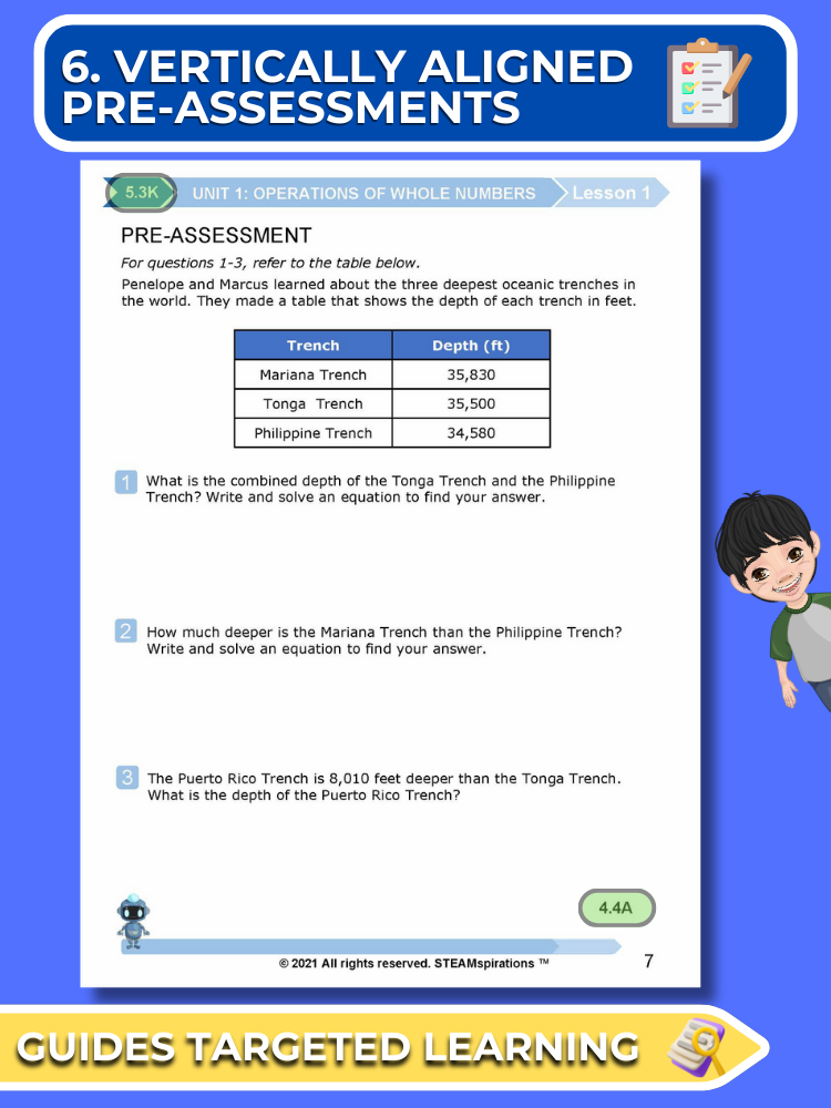 - Vertically Aligned Pre-Assessments: Our approach begins each unit with a succinct pre-assessment that aligns vertically with the new TEKs introduced, enabling focused and effective learning.
