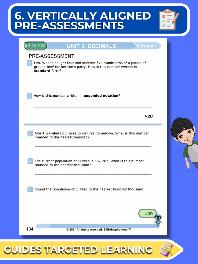- Vertically Aligned Pre-Assessments: Our approach begins each unit with a succinct pre-assessment that aligns vertically with the new TEKs introduced, enabling focused and effective learning.