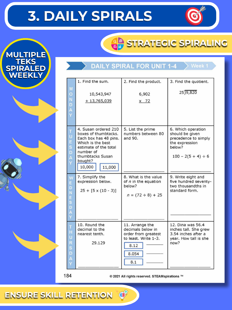 - Daily Spirals: We have structured our math program to ensure continuous review by revisiting all previously taught skills each week, thus ensuring mastery. Normally, by the 7th unit, students are reviewing over 15 skills bi-weekly, covering all material from the first four units. (HIghlight daily spiral by teks.