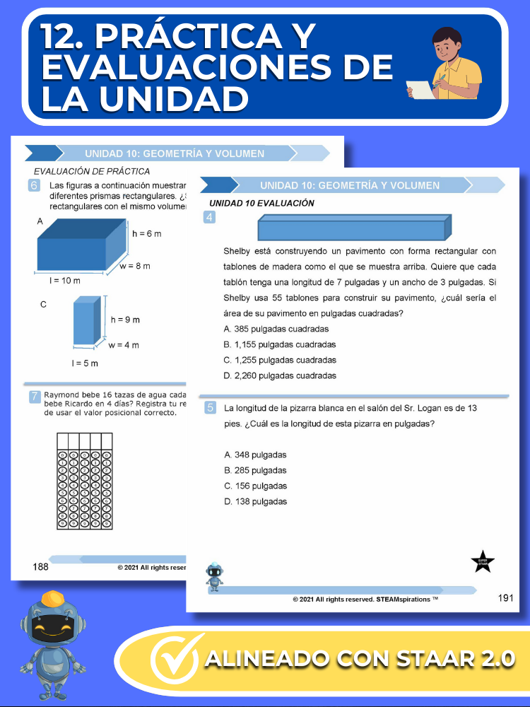 Prácticas y Evaluaciones de Unidades: Reflejando el rigor del examen STAAR, cada unidad incluye una evaluación de práctica y una evaluación de unidad integral con preguntas STAAR 2.0.