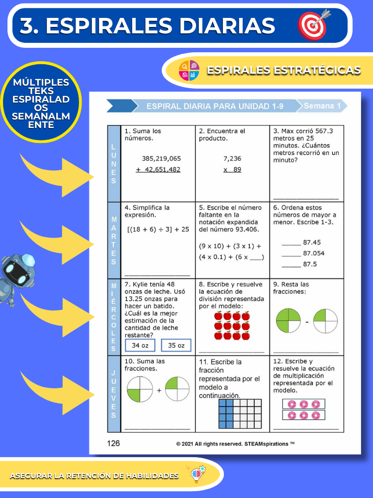 Espirales Diarias: Hemos estructurado nuestro programa de matemáticas para garantizar una revisión continua al volver a visitar todas las habilidades previamente enseñadas cada semana, asegurando así el dominio. Normalmente, para la séptima unidad, los estudiantes están revisando más de 15 habilidades quincenalmente, cubriendo todo el material de las primeras cuatro unidades. (Resaltar espiral diaria por TEKS)