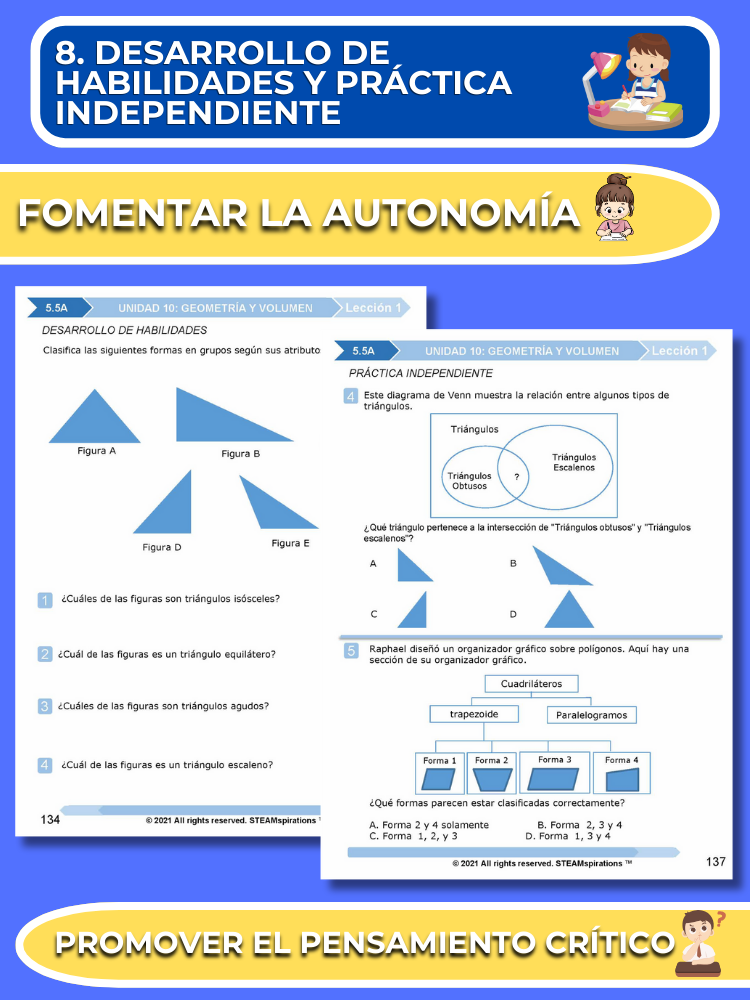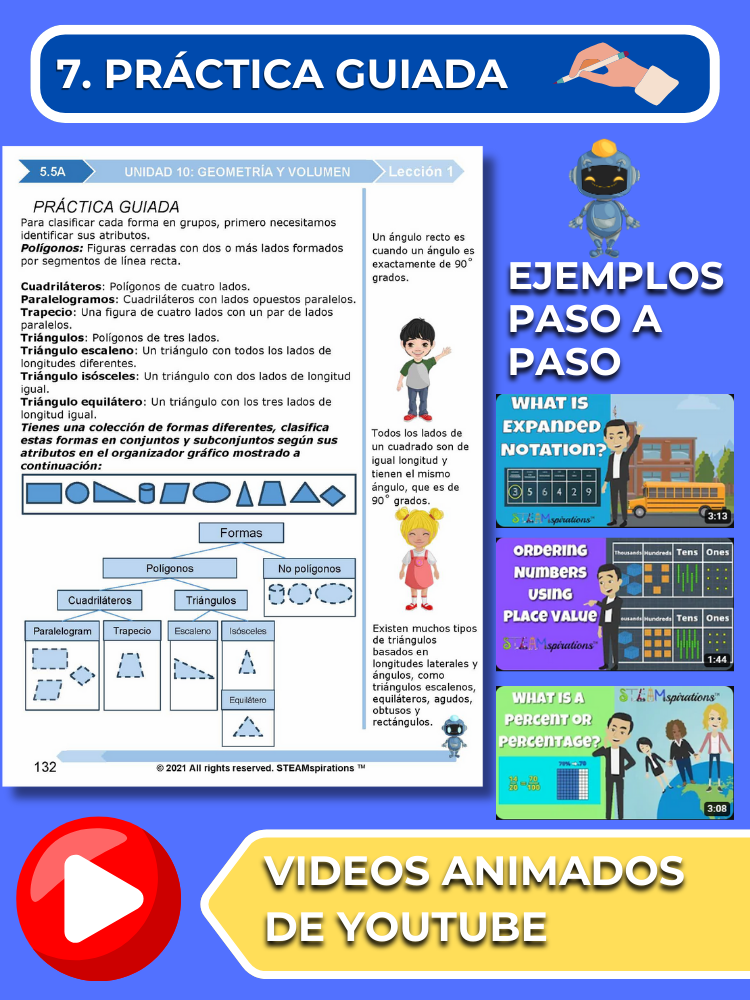 Práctica Guiada: Cada unidad incluye secciones de práctica guiada diseñadas para enseñar efectivamente nuevos TEKs/Habilidades. Estas se pueden utilizar junto con nuestros atractivos videos de instrucción animados, mejorando la experiencia de aprendizaje.