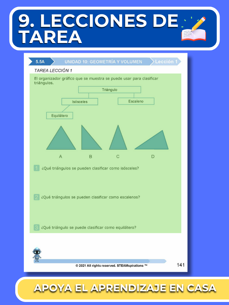 Vocabulario de Matemáticas y Preguntas Guiadas: Cada unidad introduce nuevo vocabulario de matemáticas y preguntas guiadas que pueden servir como objetivo del día o metas diarias para los maestros. Este enfoque mejora la comprensión y aplicación de conceptos y términos matemáticos, facilitando una comunicación más clara y un aprendizaje más profundo.