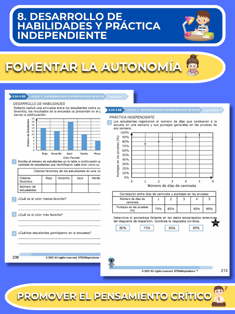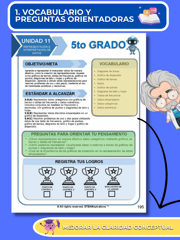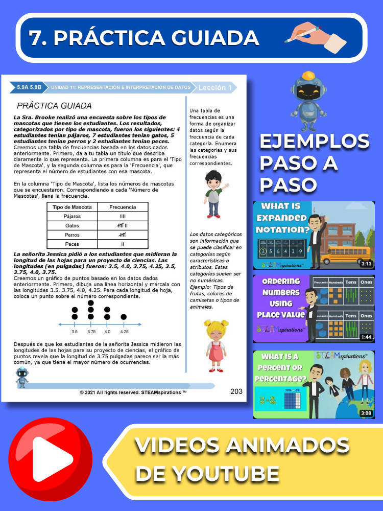 Práctica Guiada: Cada unidad incluye secciones de práctica guiada diseñadas para enseñar efectivamente nuevos TEKs/Habilidades. Estas se pueden utilizar junto con nuestros atractivos videos de instrucción animados, mejorando la experiencia de aprendizaje.