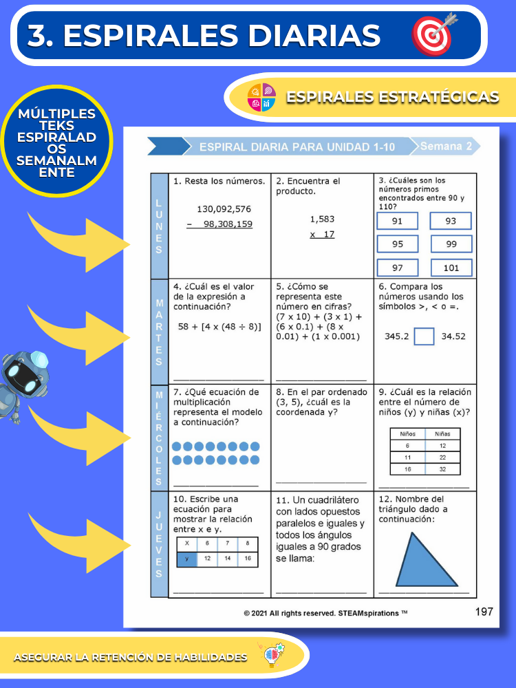 Espirales Diarias: Hemos estructurado nuestro programa de matemáticas para garantizar una revisión continua al volver a visitar todas las habilidades previamente enseñadas cada semana, asegurando así el dominio. Normalmente, para la séptima unidad, los estudiantes están revisando más de 15 habilidades quincenalmente, cubriendo todo el material de las primeras cuatro unidades. (Resaltar espiral diaria por TEKS)