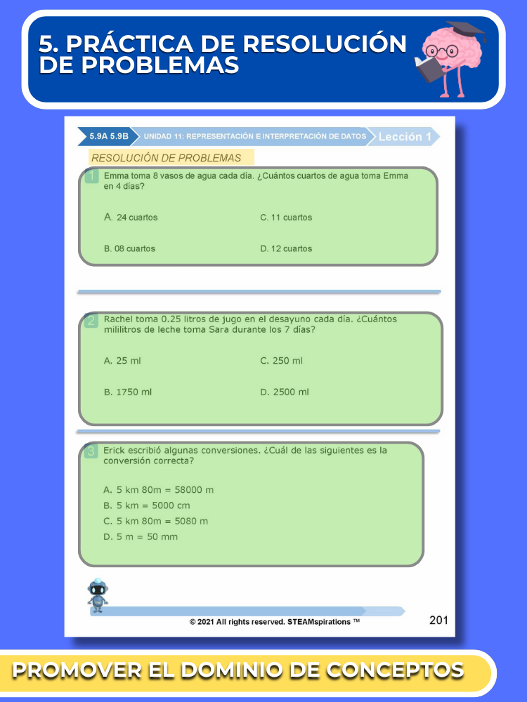 Preguntas de Resolución de Problemas: Más allá de las espirales diarias, cada lección incluye preguntas de resolución de problemas, también conocidas como preguntas del Problema del Día (P.O.D.), que refuerzan las habilidades de la lección enseñada previamente.