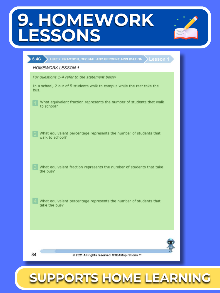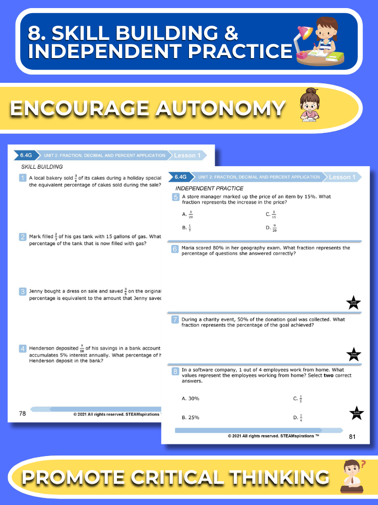 - Skill Building/Independent Practice: Lessons are designed to strengthen students’ math skills and problem-solving abilities through word problems, including STAAR 2.0 questions marked by a small star symbol.