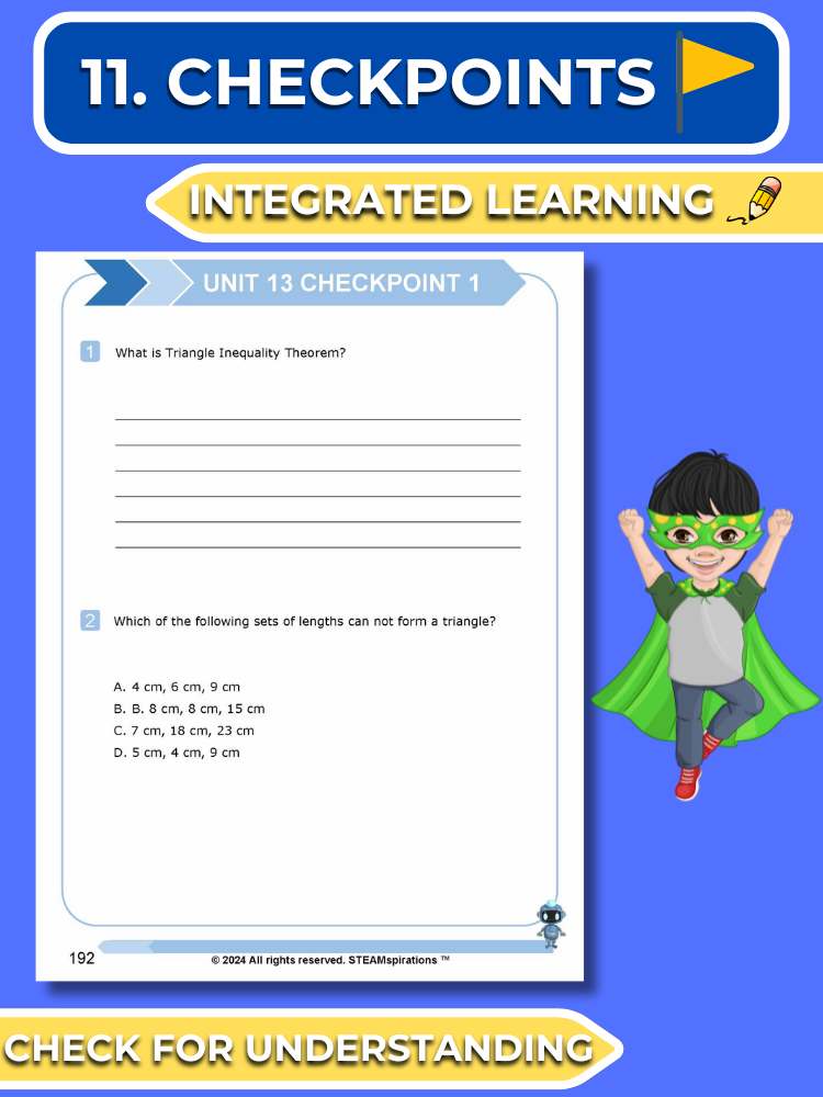 - Checkpoints: At the end of each lesson, checkpoints feature a writing exercise and a problem-solving question to assess comprehension and consolidate learning.
