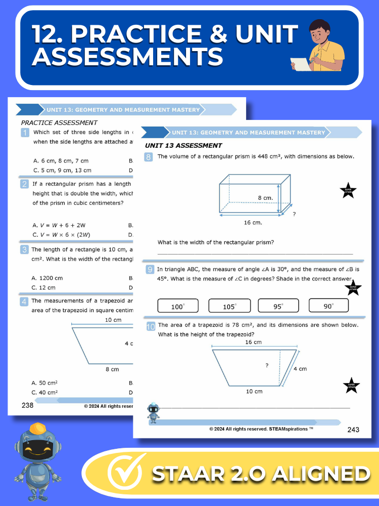 - Practice and Unit Assessments: Reflecting the STAAR test's rigor, each unit includes a practice assessment and a comprehensive unit assessment featuring STAAR 2.0 questions.