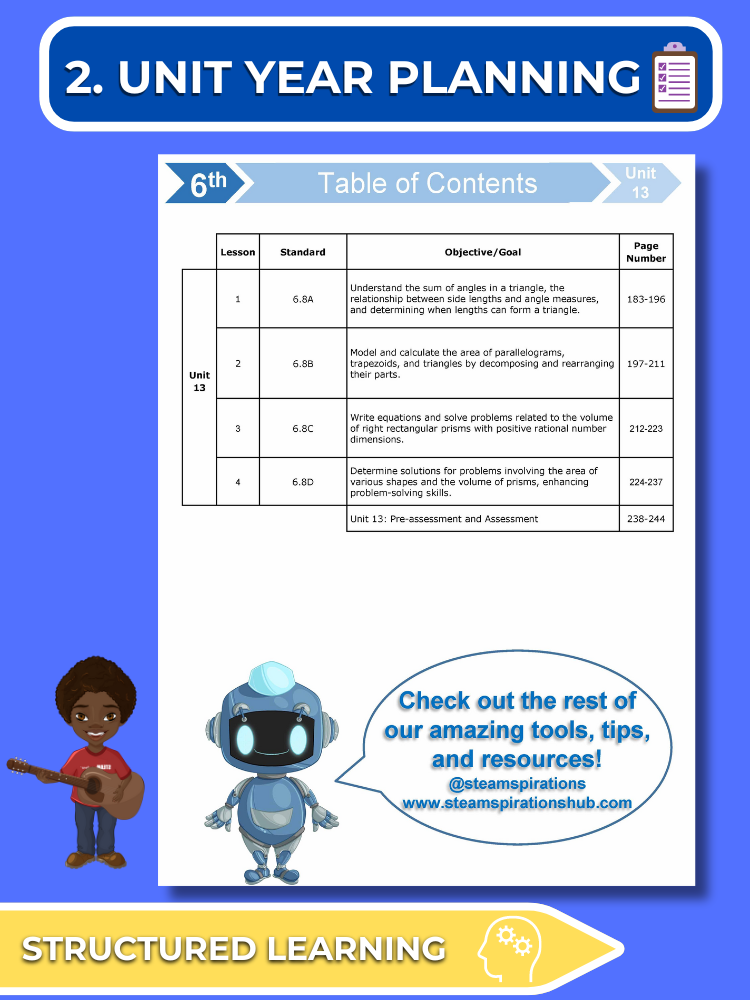- Unit Year Planning: Our curriculum breaks down each TEK into manageable segments, scaffolding learning for complete mastery. This methodical approach allows students to fully understand each part of the TEK as it is taught throughout the lessons, making the process more straightforward for educators.