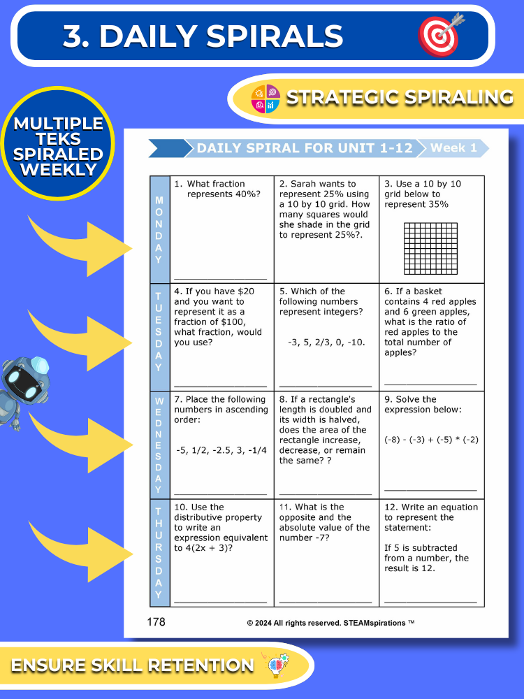 - Daily Spirals: We have structured our math program to ensure continuous review by revisiting all previously taught skills each week, thus ensuring mastery. Normally, by the 7th unit, students are reviewing over 15 skills bi-weekly, covering all material from the first four units. (HIghlight daily spiral by teks.