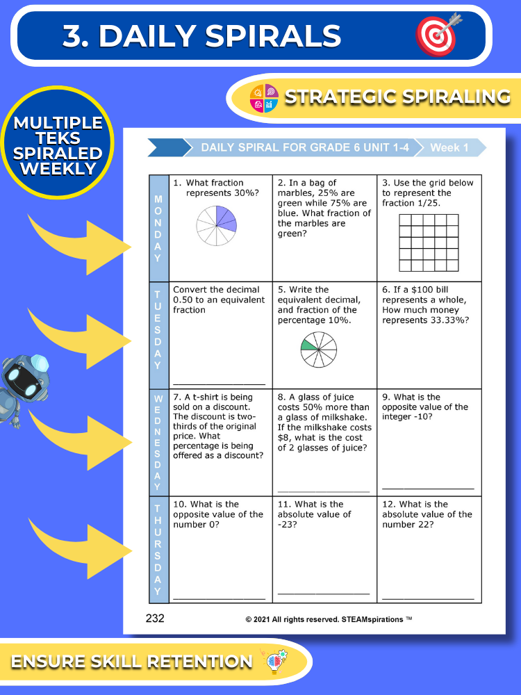 - Daily Spirals: We have structured our math program to ensure continuous review by revisiting all previously taught skills each week, thus ensuring mastery. Normally, by the 7th unit, students are reviewing over 15 skills bi-weekly, covering all material from the first four units. (HIghlight daily spiral by teks.
