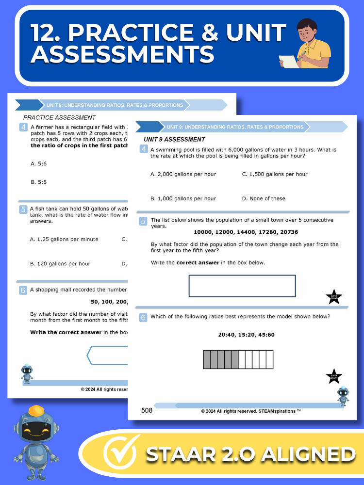 Practice and Unit Assessments: Reflecting the STAAR test's rigor, each unit includes a practice assessment and a comprehensive unit assessment featuring STAAR 2.0 questions.