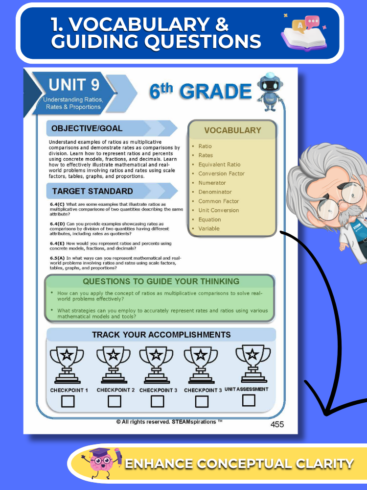 - Vertically Aligned Pre-Assessments: Our approach begins each unit with a succinct pre-assessment that aligns vertically with the new TEKs introduced, enabling focused and effective learning.