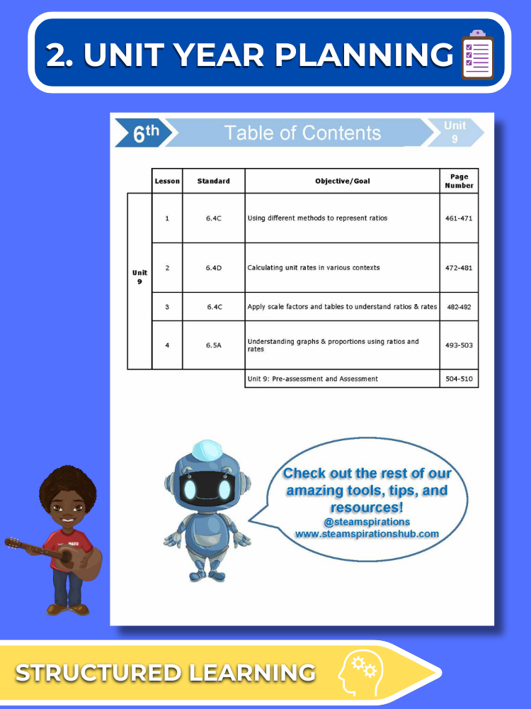 - Unit Year Planning: Our curriculum breaks down each TEK into manageable segments, scaffolding learning for complete mastery. This methodical approach allows students to fully understand each part of the TEK as it is taught throughout the lessons, making the process more straightforward for educators.