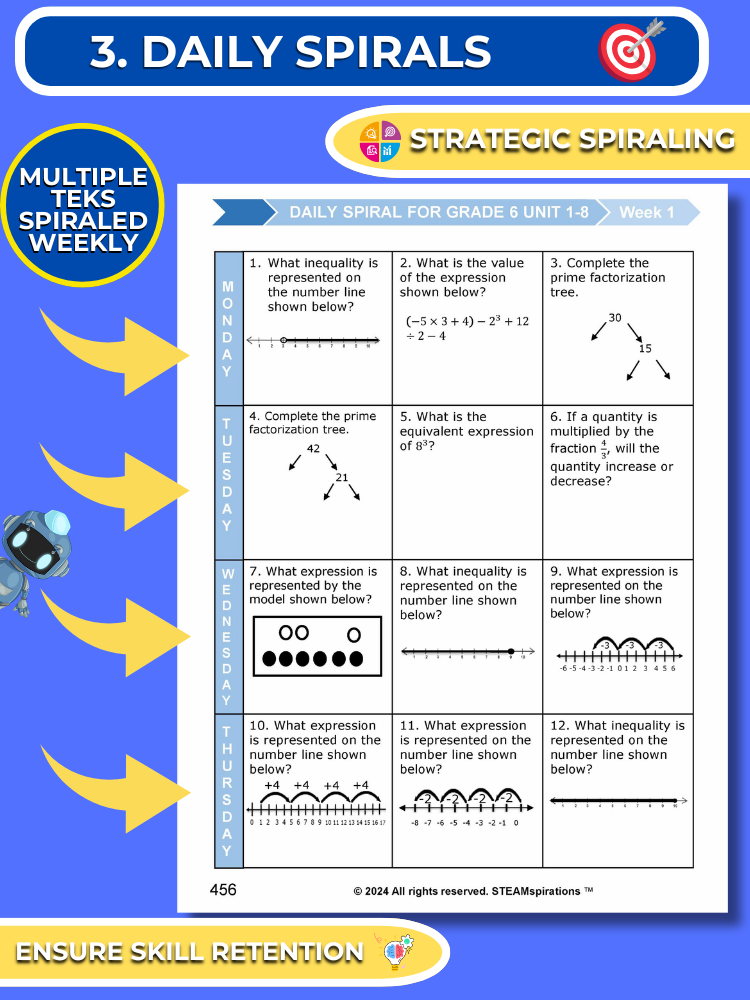- Daily Spirals: We have structured our math program to ensure continuous review by revisiting all previously taught skills each week, thus ensuring mastery. Normally, by the 7th unit, students are reviewing over 15 skills bi-weekly, covering all material from the first four units. (HIghlight daily spiral by teks.