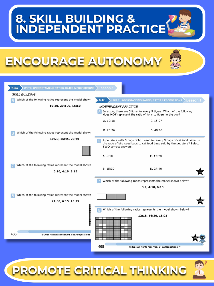 - Skill Building/Independent Practice: Lessons are designed to strengthen students’ math skills and problem-solving abilities through word problems, including STAAR 2.0 questions marked by a small star symbol.