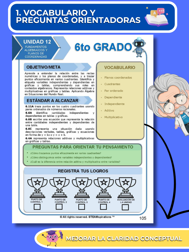 - Pre-Evaluaciones Alineadas Verticalmente: Nuestro enfoque comienza cada unidad con una pre-evaluación sucinta que se alinea verticalmente con los nuevos TEKs introducidos, permitiendo un aprendizaje enfocado y efectivo.