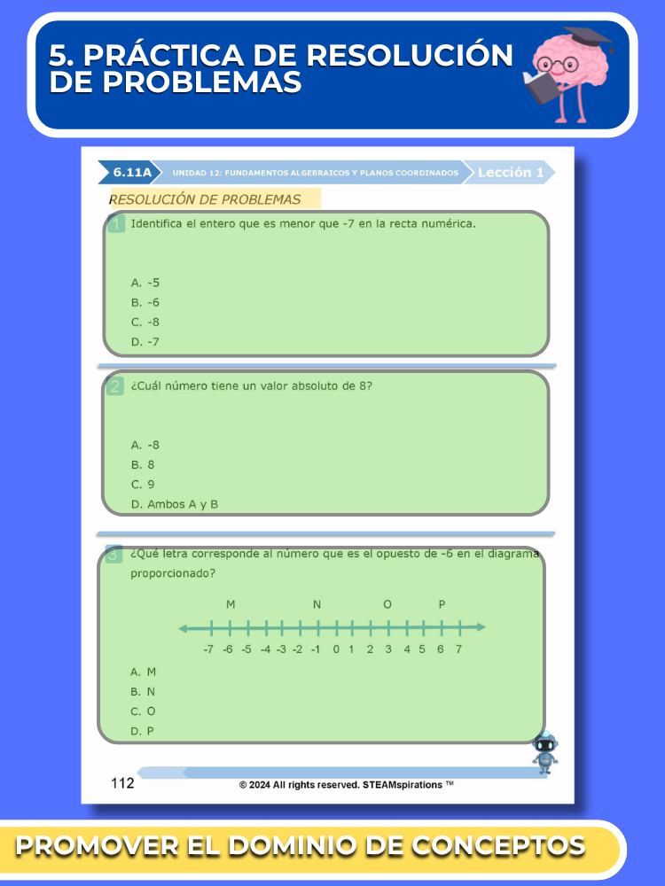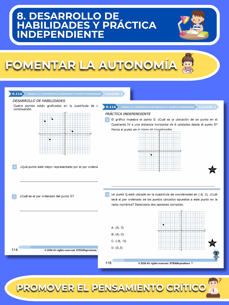 - Práctica Guiada: Cada unidad incluye secciones de práctica guiada diseñadas para enseñar efectivamente nuevos TEKs/Habilidades. Estas se pueden utilizar junto con nuestros atractivos videos de instrucción animados, mejorando la experiencia de aprendizaje.