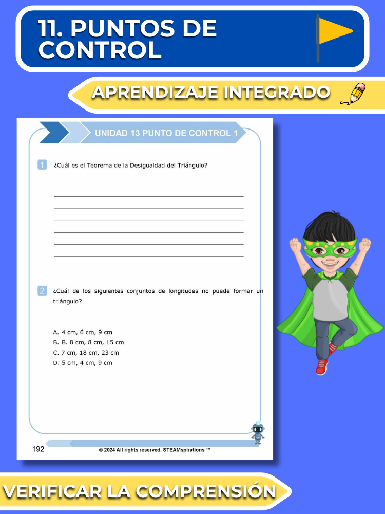 - Puntos de Control: Al final de cada lección, los puntos de control incluyen un ejercicio de escritura y una pregunta de resolución de problemas para evaluar la comprensión y consolidar el aprendizaje.