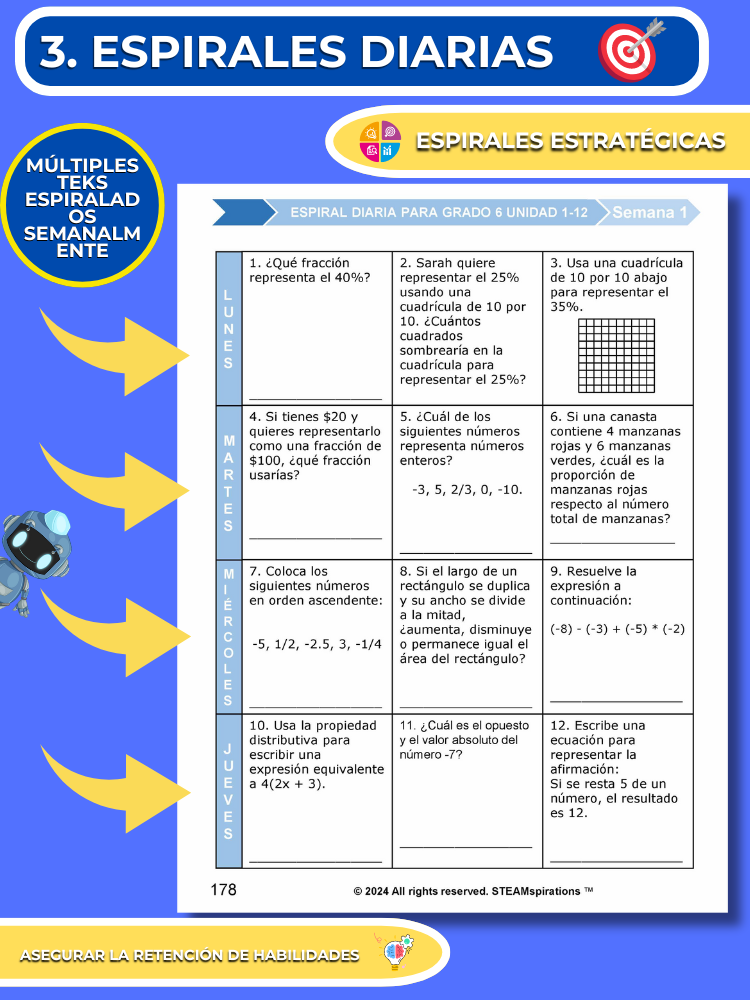 - Espirales Diarias: Hemos estructurado nuestro programa de matemáticas para garantizar una revisión continua al volver a visitar todas las habilidades previamente enseñadas cada semana, asegurando así el dominio. Normalmente, para la séptima unidad, los estudiantes están revisando más de 15 habilidades quincenalmente, cubriendo todo el material de las primeras cuatro unidades. (Resaltar espiral diaria por TEKS)