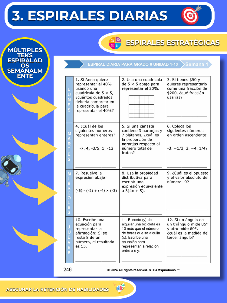 - Pre-Evaluaciones Alineadas Verticalmente: Nuestro enfoque comienza cada unidad con una pre-evaluación sucinta que se alinea verticalmente con los nuevos TEKs introducidos, permitiendo un aprendizaje enfocado y efectivo.