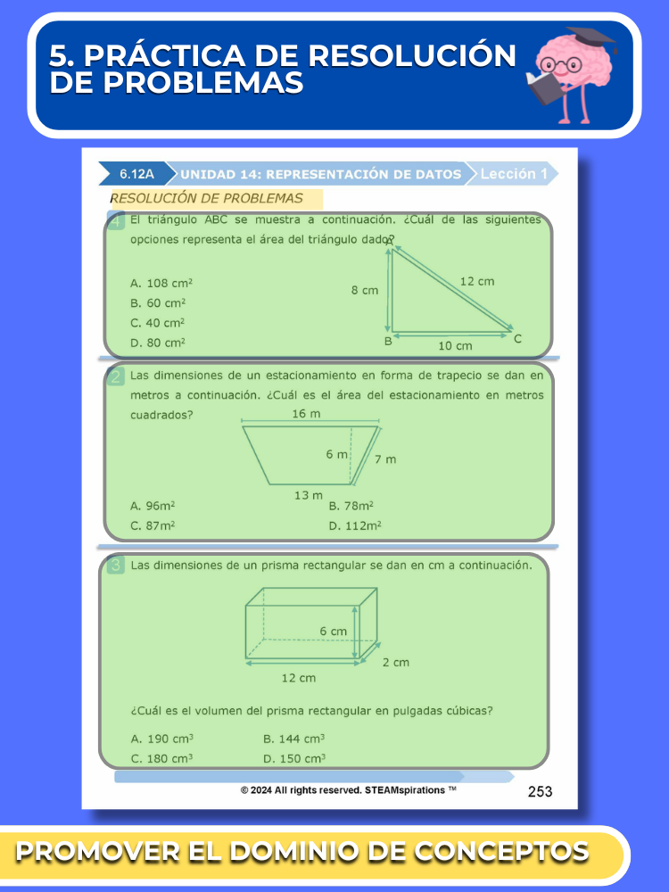 - Construcción de Habilidades/Práctica Independiente: Las lecciones están diseñadas para fortalecer las habilidades matemáticas y las habilidades de resolución de problemas de los estudiantes a través de problemas de palabras, incluyendo preguntas STAAR 2.0 marcadas con un pequeño símbolo de estrella.