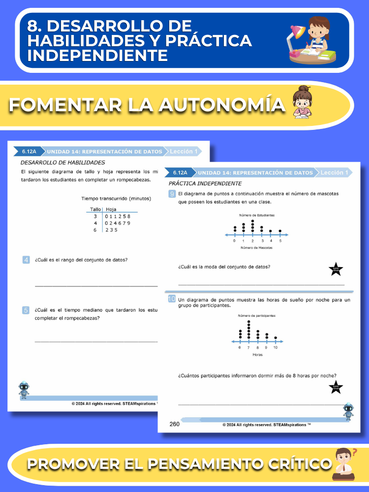 - Práctica Guiada: Cada unidad incluye secciones de práctica guiada diseñadas para enseñar efectivamente nuevos TEKs/Habilidades. Estas se pueden utilizar junto con nuestros atractivos videos de instrucción animados, mejorando la experiencia de aprendizaje.