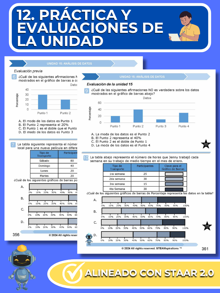- Prácticas y Evaluaciones de Unidades: Reflejando el rigor del examen STAAR, cada unidad incluye una evaluación de práctica y una evaluación de unidad integral con preguntas STAAR 2.0.