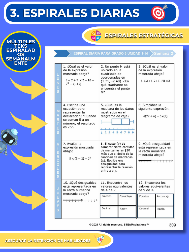 - Espirales Diarias: Hemos estructurado nuestro programa de matemáticas para garantizar una revisión continua al volver a visitar todas las habilidades previamente enseñadas cada semana, asegurando así el dominio. Normalmente, para la séptima unidad, los estudiantes están revisando más de 15 habilidades quincenalmente, cubriendo todo el material de las primeras cuatro unidades. (Resaltar espiral diaria por TEKS)