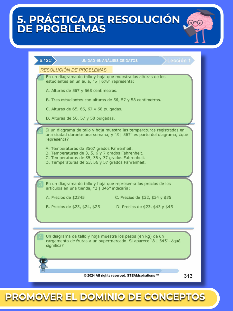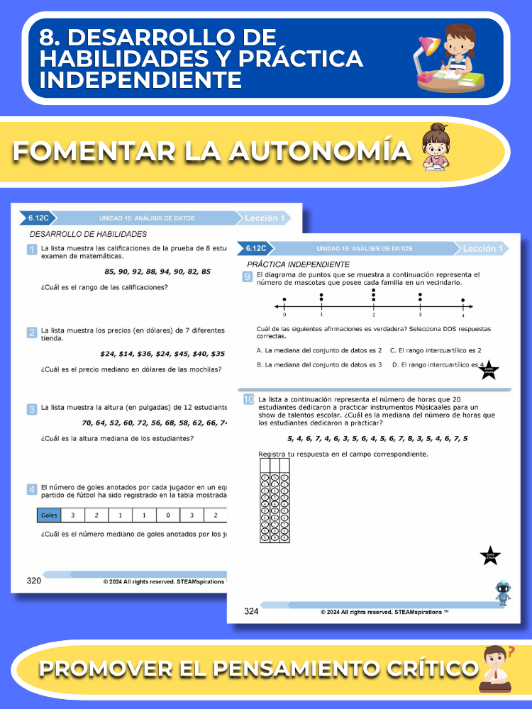- Proceso de Resolución de Problemas: Cada unidad presenta a los estudiantes un proceso de resolución de problemas que provoca curiosidad y mejora las habilidades de pensamiento analítico.