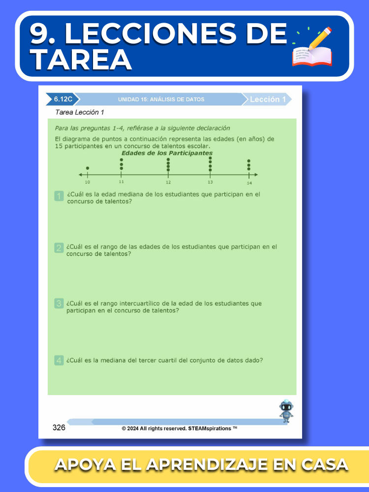 - Construcción de Habilidades/Práctica Independiente: Las lecciones están diseñadas para fortalecer las habilidades matemáticas y las habilidades de resolución de problemas de los estudiantes a través de problemas de palabras, incluyendo preguntas STAAR 2.0 marcadas con un pequeño símbolo de estrella.
