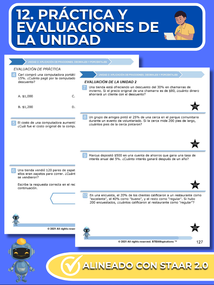 Prácticas y Evaluaciones de Unidades: Reflejando el rigor del examen STAAR, cada unidad incluye una evaluación de práctica y una evaluación de unidad integral con preguntas STAAR 2.0.