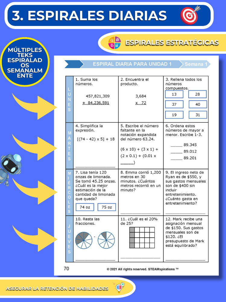 Espirales Diarias: Hemos estructurado nuestro programa de matemáticas para garantizar una revisión continua al volver a visitar todas las habilidades previamente enseñadas cada semana, asegurando así el dominio. Normalmente, para la séptima unidad, los estudiantes están revisando más de 15 habilidades quincenalmente, cubriendo todo el material de las primeras cuatro unidades. (Resaltar espiral diaria por TEKS)