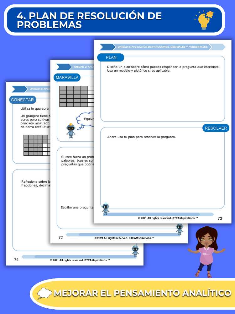 Proceso de Resolución de Problemas: Cada unidad presenta a los estudiantes un proceso de resolución de problemas que provoca curiosidad y mejora las habilidades de pensamiento analítico.