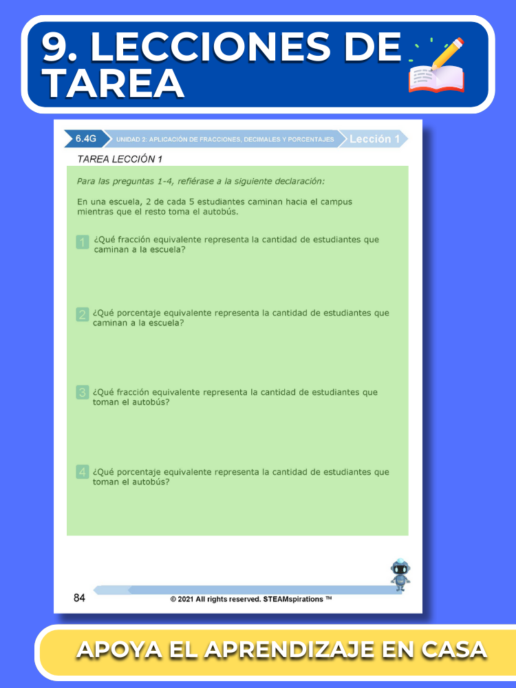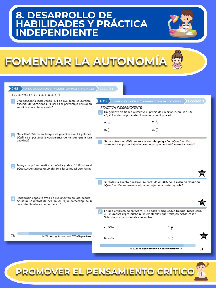 Construcción de Habilidades/Práctica Independiente: Las lecciones están diseñadas para fortalecer las habilidades matemáticas y las habilidades de resolución de problemas de los estudiantes a través de problemas de palabras, incluyendo preguntas STAAR 2.0 marcadas con un pequeño símbolo de estrella.