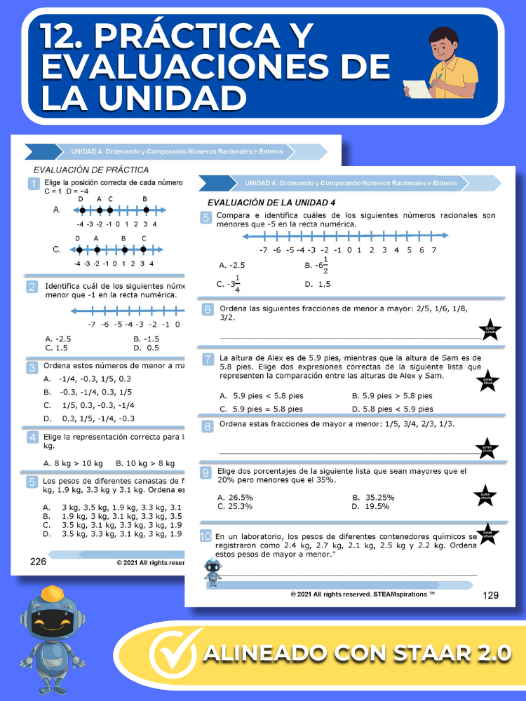 Prácticas y Evaluaciones de Unidades: Reflejando el rigor del examen STAAR, cada unidad incluye una evaluación de práctica y una evaluación de unidad integral con preguntas STAAR 2.0.