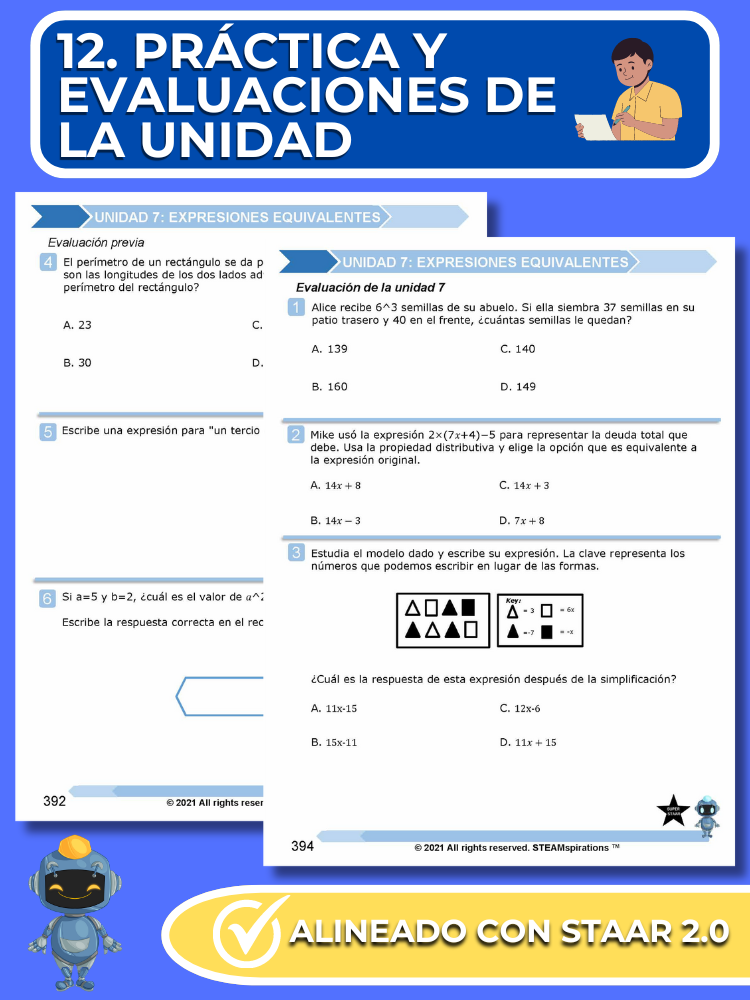Prácticas y Evaluaciones de Unidades: Reflejando el rigor del examen STAAR, cada unidad incluye una evaluación de práctica y una evaluación de unidad integral con preguntas STAAR 2.0.