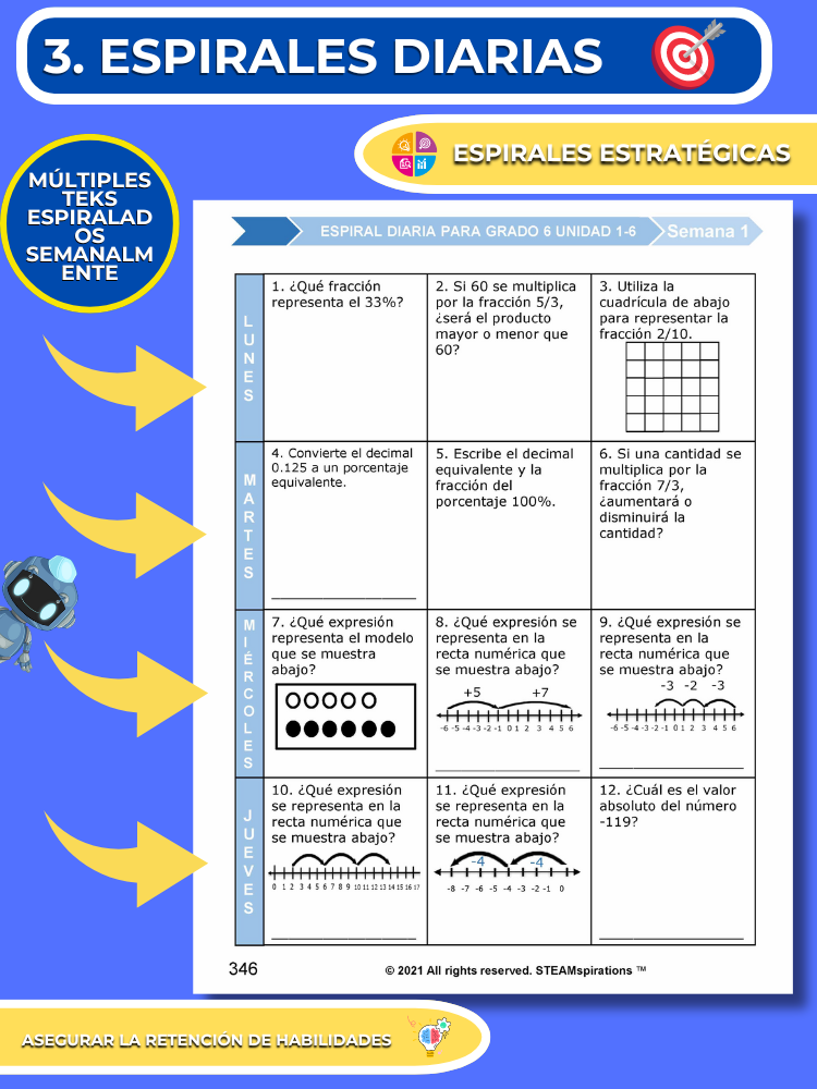 Espirales Diarias: Hemos estructurado nuestro programa de matemáticas para garantizar una revisión continua al volver a visitar todas las habilidades previamente enseñadas cada semana, asegurando así el dominio. Normalmente, para la séptima unidad, los estudiantes están revisando más de 15 habilidades quincenalmente, cubriendo todo el material de las primeras cuatro unidades. (Resaltar espiral diaria por TEKS)