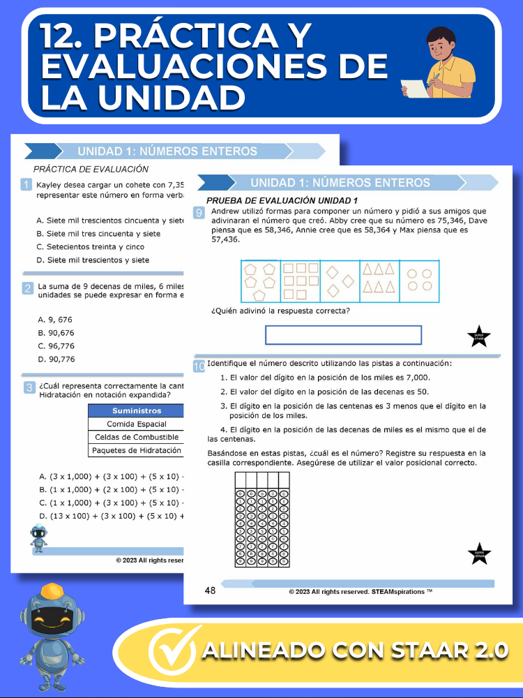 Prácticas y Evaluaciones de Unidades: Reflejando el rigor del examen STAAR, cada unidad incluye una evaluación de práctica y una evaluación de unidad integral con preguntas STAAR 2.0.