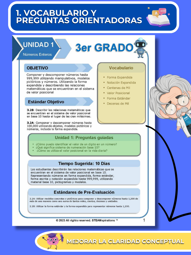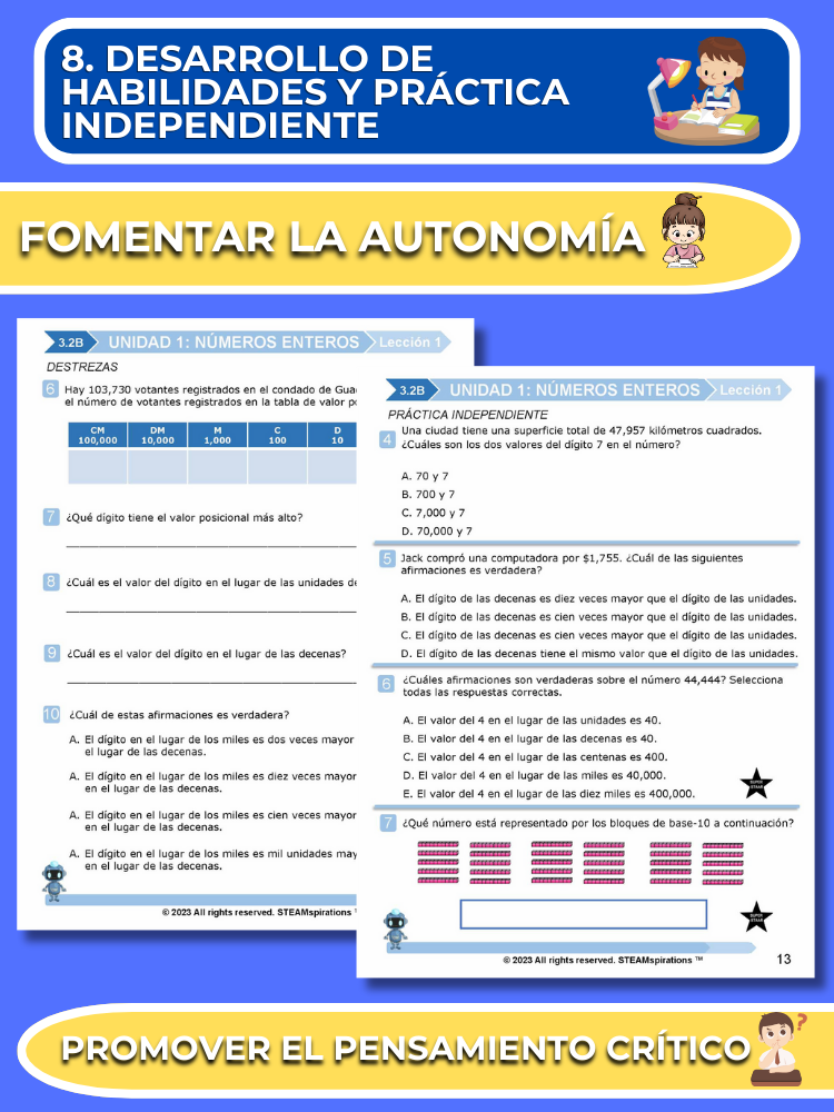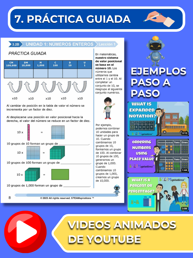 Práctica Guiada: Cada unidad incluye secciones de práctica guiada diseñadas para enseñar efectivamente nuevos TEKs/Habilidades. Estas se pueden utilizar junto con nuestros atractivos videos de instrucción animados, mejorando la experiencia de aprendizaje.