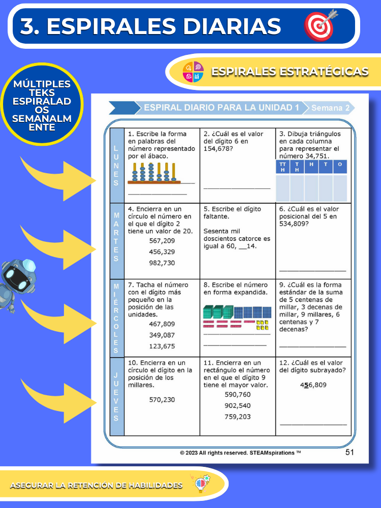 Espirales Diarias: Hemos estructurado nuestro programa de matemáticas para garantizar una revisión continua al volver a visitar todas las habilidades previamente enseñadas cada semana, asegurando así el dominio. Normalmente, para la séptima unidad, los estudiantes están revisando más de 15 habilidades quincenalmente, cubriendo todo el material de las primeras cuatro unidades. (Resaltar espiral diaria por TEKS)