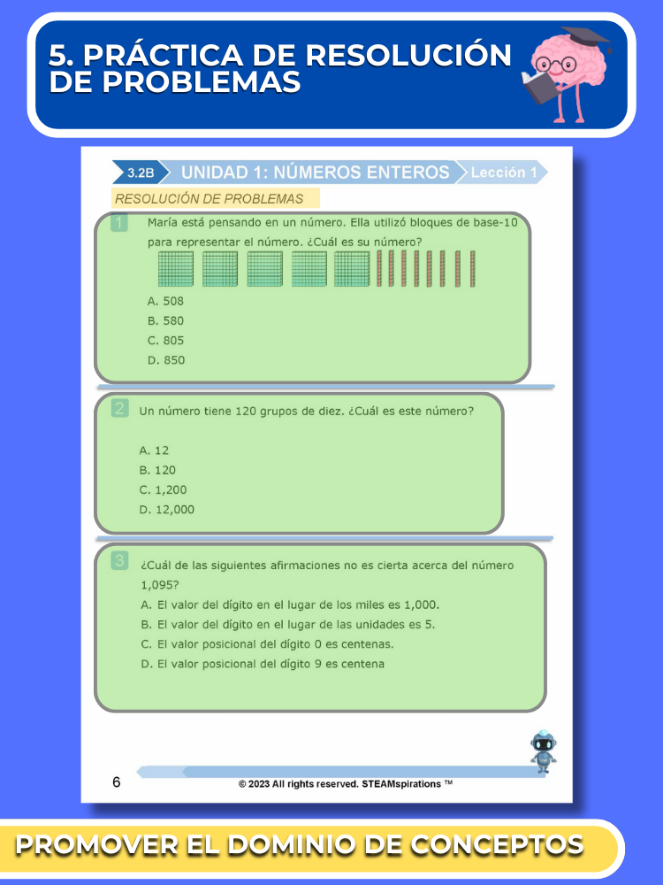 Preguntas de Resolución de Problemas: Más allá de las espirales diarias, cada lección incluye preguntas de resolución de problemas, también conocidas como preguntas del Problema del Día (P.O.D.), que refuerzan las habilidades de la lección enseñada previamente.