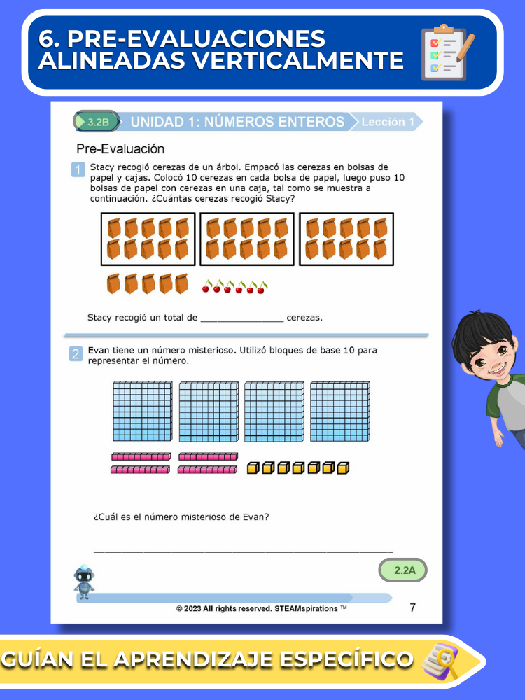 Pre-Evaluaciones Alineadas Verticalmente: Nuestro enfoque comienza cada unidad con una pre-evaluación sucinta que se alinea verticalmente con los nuevos TEKs introducidos, permitiendo un aprendizaje enfocado y efectivo.