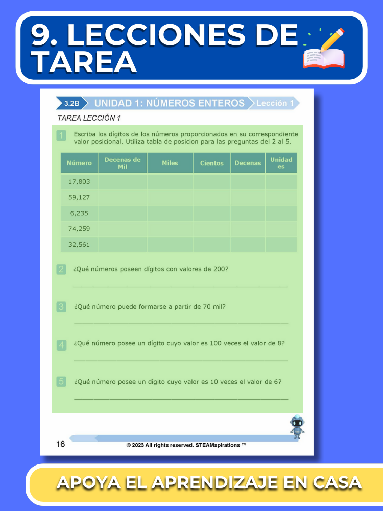 Vocabulario de Matemáticas y Preguntas Guiadas: Cada unidad introduce nuevo vocabulario de matemáticas y preguntas guiadas que pueden servir como objetivo del día o metas diarias para los maestros. Este enfoque mejora la comprensión y aplicación de conceptos y términos matemáticos, facilitando una comunicación más clara y un aprendizaje más profundo.