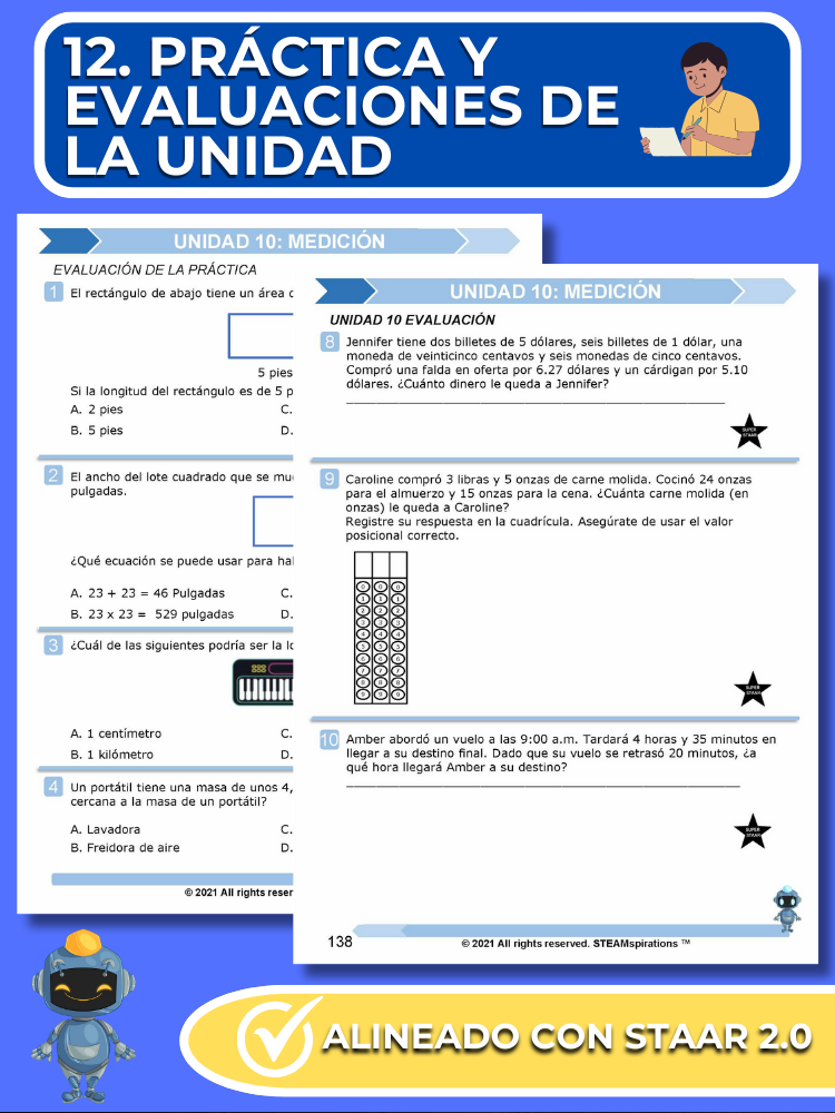 Prácticas y Evaluaciones de Unidades: Reflejando el rigor del examen STAAR, cada unidad incluye una evaluación de práctica y una evaluación de unidad integral con preguntas STAAR 2.0.