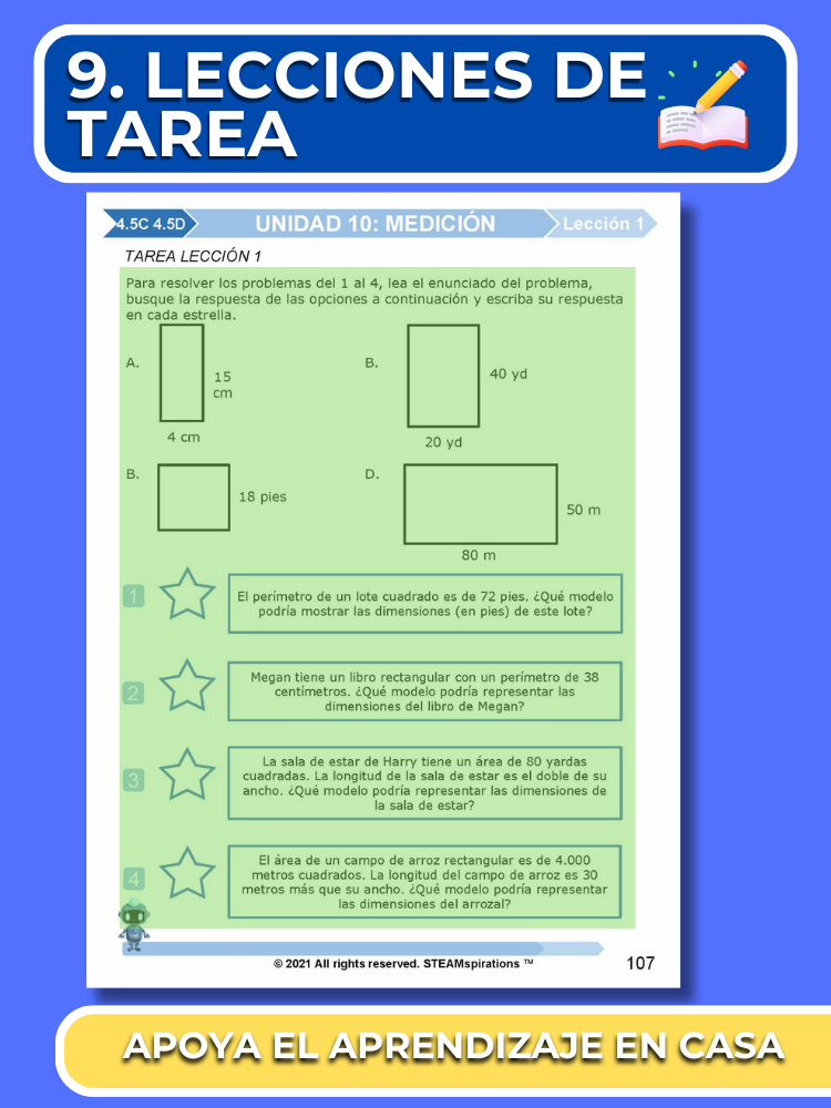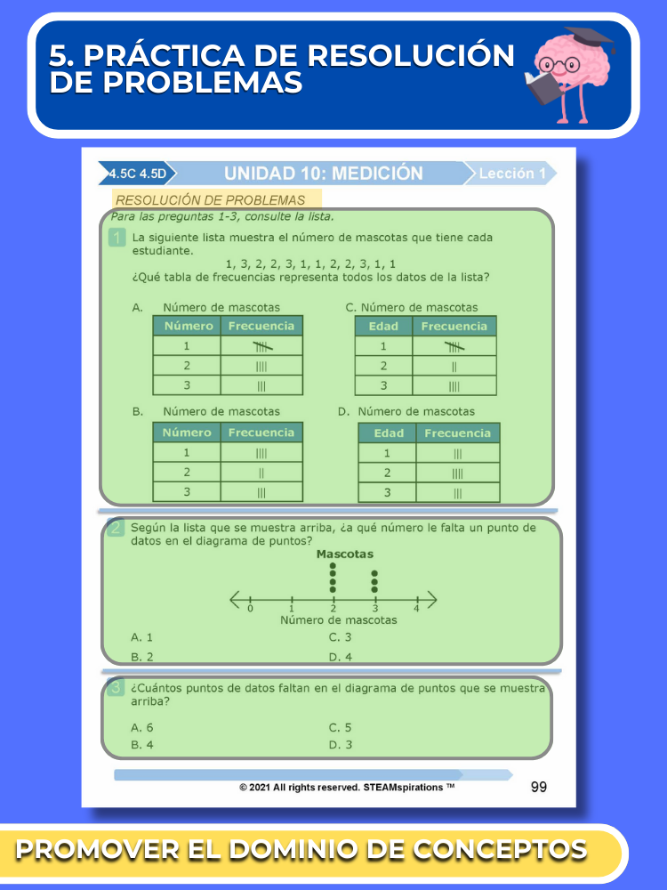 Construcción de Habilidades/Práctica Independiente: Las lecciones están diseñadas para fortalecer las habilidades matemáticas y las habilidades de resolución de problemas de los estudiantes a través de problemas de palabras, incluyendo preguntas STAAR 2.0 marcadas con un pequeño símbolo de estrella.