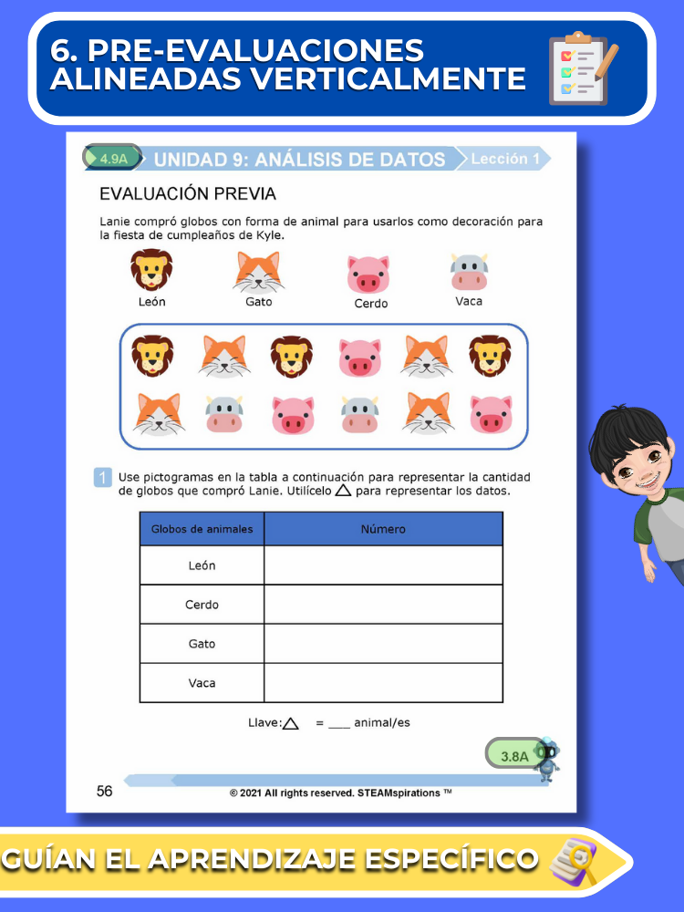 Pre-Evaluaciones Alineadas Verticalmente: Nuestro enfoque comienza cada unidad con una pre-evaluación sucinta que se alinea verticalmente con los nuevos TEKs introducidos, permitiendo un aprendizaje enfocado y efectivo.